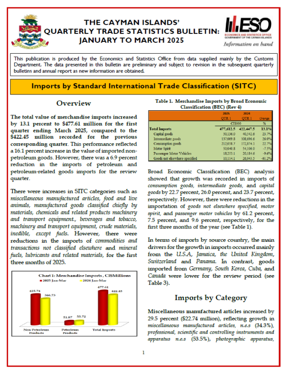 The total value of goods imported to the Cayman Islands was $1.65 billion in 2024, an increase of 8.3 percent over the previous year. This growth was driven primarily by the increase in non-petroleum imports, which grew by 9.0 percent... READ MORE